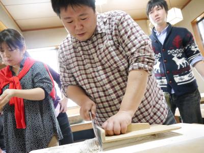 Danach verließen wir dann das Hotel und machten uns auf den Weg zu einer kleinen Soba Fertigung. Soba sind japanische Nudeln und diese wollten wir selber herstellen und dann essen.